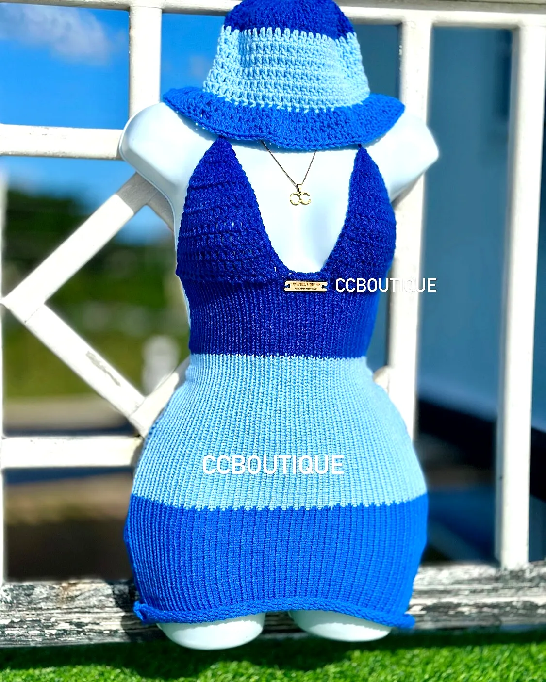 Upgrade your summer wardrobe with this stunning Blue and White Crochet Dress, a fitted, sleeveless design featuring a deep V-neckline and a bodycon shape that beautifully accentuates your figure, all complemented by a chic matching hat.