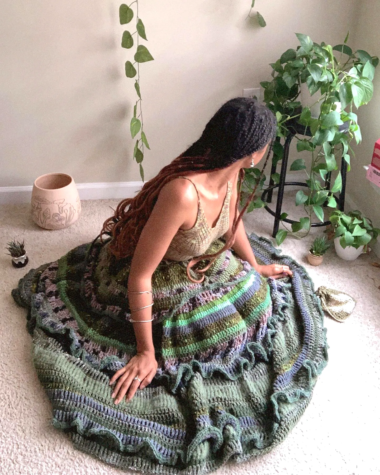 Embrace effortless bohemian style with this stunning green crochet skirt, a maxi dress that beautifully features a flowing silhouette and intricate multicolored patterns in earthy tones of green and purple.